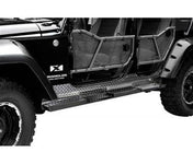 Fits 2007 to 2012 JK Wrangler Rubicon Unlimited 4-door models Black powder coat Black powder coat aluminum diamond plate step 2 steps per side Heavy-duty 2x4" rectanglar steel Polyurethane end caps Easy to install, Rock Bars are constructed of heavy-duty 2 x 4 rectangular steel, and designed to protect the entire length of the rocker panel. Polyurethane end caps keep the tube free of debris. Black powder-coated for durability, each bar has a provision for an optional diamond plate entry step.