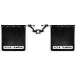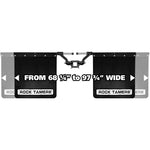All Rock Tamers Mudflaps Systems can easily be taken on and off, use it when you’re towing and remove it when you’re not. One inch of space is required on the ball mount for fitment. Overall width of the 00112 is adjustable from 68 1/4″ to 97 3/4″. Mudflap dimensions are 24 x 24″ and they can be trimmed to maintain consistent ground clearance when towing various loads. Features forged aluminum hub and adjustable arms, stainless sleeved steel rods, UV protected matte black finish and stainless/zinc nickel hardware. Includes one 00112, 2 Rock Tamers trim plates, 13 bolt bumpers and a detailed manual instructions in English and French included. PROTECT WHAT YOU TOW!