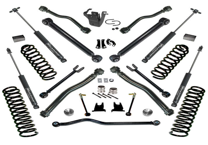 • Front and rear coil springs, sway bar correction, shocks, rear axle mounted track bar bracket, brake line brackets, and all hardware required specific to the 2007-2018 4wd Jeep Wrangler JK 2 dr