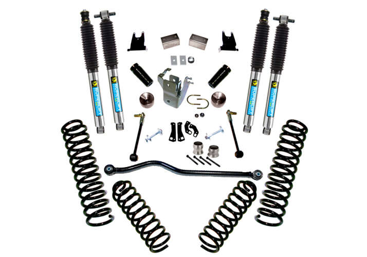 This is the Superlift 4 inch lift kit with Superlift shocks or Bilstein shocks for the 2007-2018 Jeep Wrangler JK. Superlifts 4 inch � lift for the Jeep Wrangler JK with Superlift shocks, Bilstein shocks is the ultimate combination of performance and value. Pre-set replacement coil springs minimize settling, provide exceptional ride quality and the rear coils are rate specific for 4 door models. Front track bar correction is accomplished via a new REFLEX adjustable track bar. This route is preferred over using a relocation bracket because the bar's arc of travel must remain in sync with the drag link's arc of travel; if they get out of sync, steering wheel "kick" will result. A track bar relocation bracket is used at the rear axle since there are no steering geometry issues to contend with. Compression travel is controlled via unique machined aluminum receiver cups in the front and replacement closed-cell foam dampeners in the rear. New front axle alignment cams, extended length sway bar links with factory style, tie-rod type upper ends, front / rear brake hose relocation brackets and emergency brake cable brackets are also included. Nothing is left unattended with this kit and it is packaged complete with Superlift Shocks, custom valved Bilstein Shocks. This 4-inch lift kit is compatible with the factory stability control program.