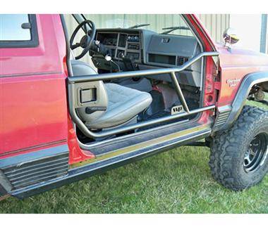 Designed to replace the vehicles factory doors, Tube Doors provide additional protection to front seat occupants while venturing off-road. Tube Doors mount into existing door hinges and come with our deluxe paddle handle latch system. This XJ Cherokee model introduces our newest paddle handle design, which fits perfectly to the factory door pin striker, and features a rubber bumper-stop to reduce door / paddle rattle. The entire assembly is black powder-coat painted to provide a durable finish.